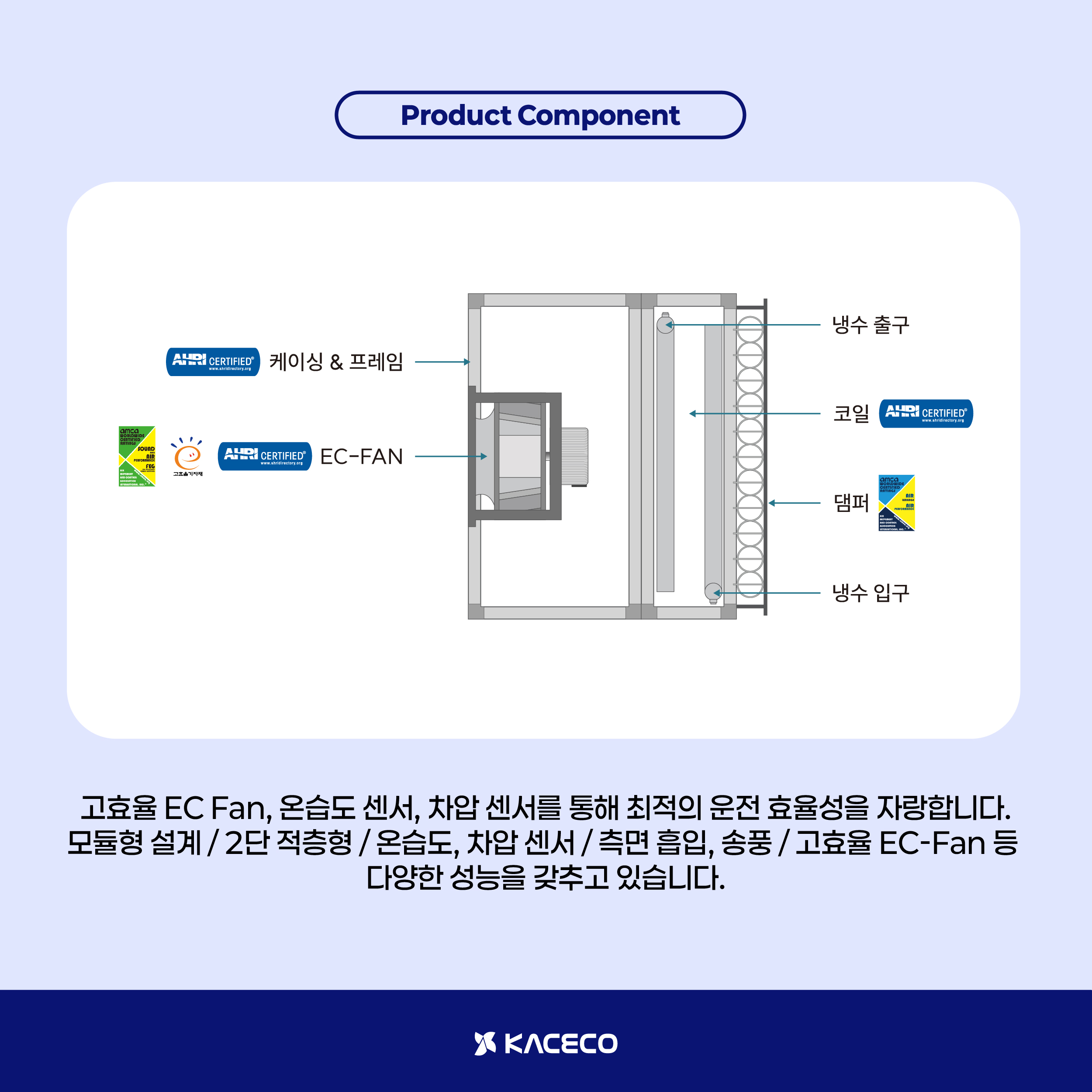 EC Fan을 적용하여 에너지 효율적인 운전이 가능하며, 안정적인 풍량 제어를 통해 공조 성능을 유지합니다.